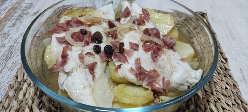 Lubina pescado en el horno con patatas, cebolla, pasas y jamón.