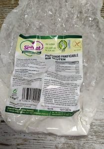 Usé 130 gr. del preparadado panificable Sinbat que compré en el Lidl y y 50 gr. de Maizena (Almidón de maíz), también podéis usar 90 gr. de harina de arroz y 90 gr. de Maizena (Almidón de Maíz) u otra harina sin gluten.