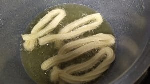 • Esperamos que se caliente el aceite y ya vamos añadiendo los lazos, freímos.
