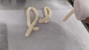 • En un papel de horno voy haciendo los lazos o si preferimos sobre el aceite caliente.