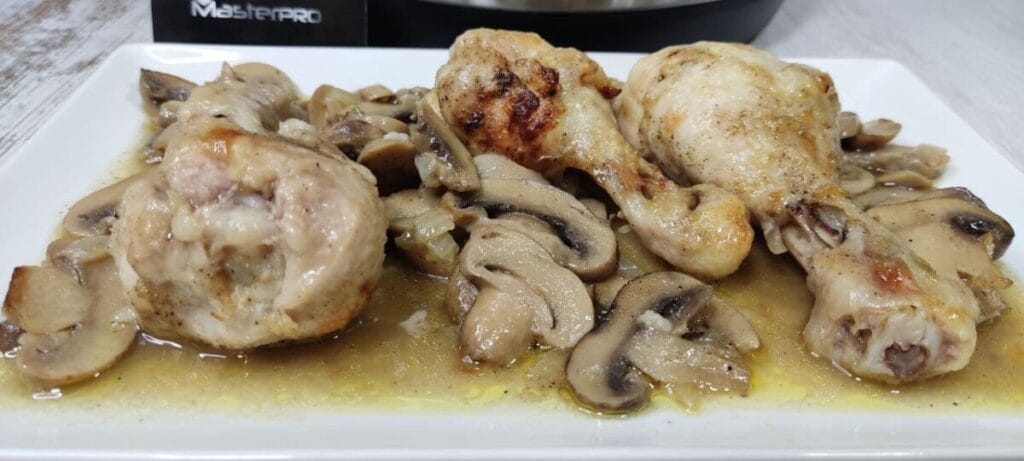 Añado los champiñones con el liquido de la lata, si son champiñones naturales añadimos un poco más de medio vaso de agua.