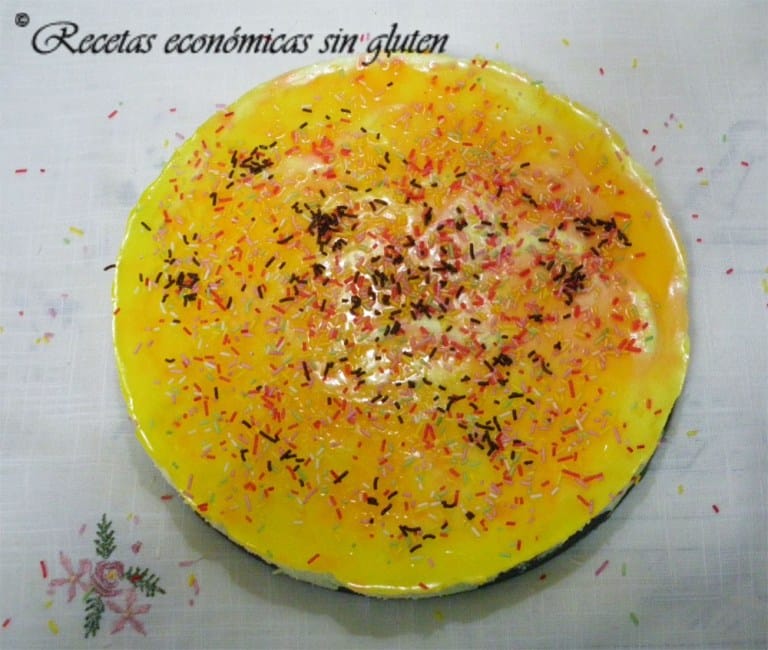 Antes de servir la tarta se puede echar por encima fideos de chocolate y de colores, pero solo un poco antes porque los fideos de colores se disuelven con la gelatina.