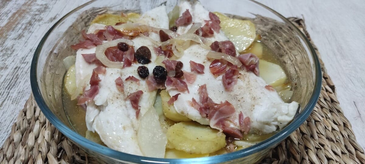 Cómo preparar lubina a la sidra en el horno con pasas, jamón y patatas